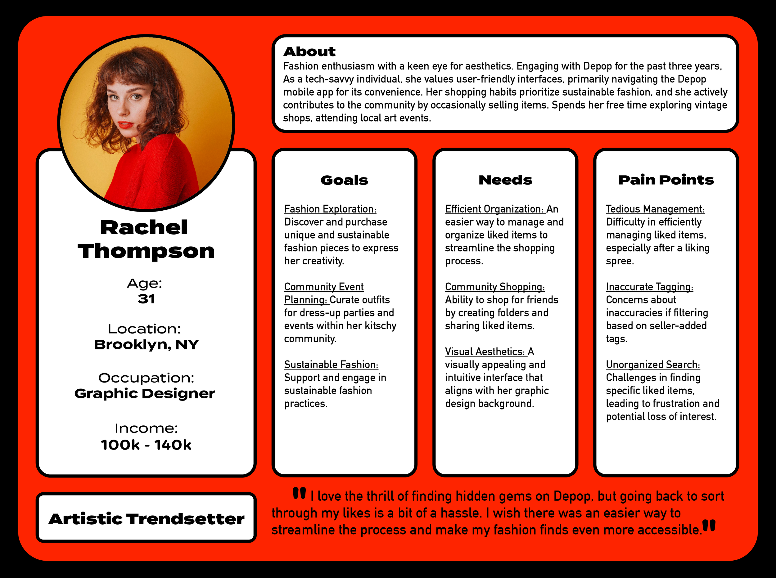 After synthesizing my findings from the user interviews and other research, I developed a persona that represents the typical Depop user who would benefit from enhanced filtering and organizational features. Rachel embodies the key characteristics, needs, and pain points identified in the research, guiding the design process to ensure it addresses the most pertinent user challenges and enhances overall user satisfaction.