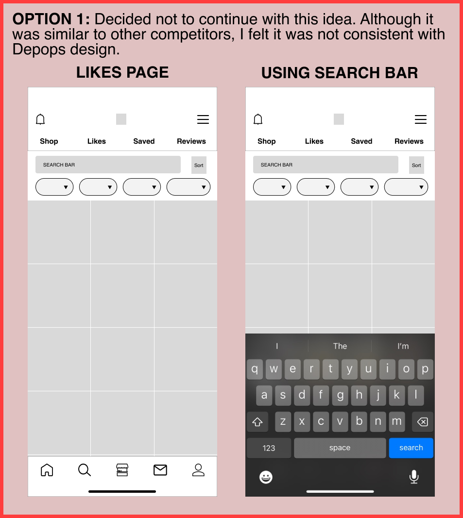 I integrated components from the established Depop brand into the wireframes. After several iterations, I developed the final design shown below. My goal was to enhance the user experience by making it easy and intuitive to filter and organize liked items without overwhelming the user or distracting from their primary objective of browsing and managing their saved collections.