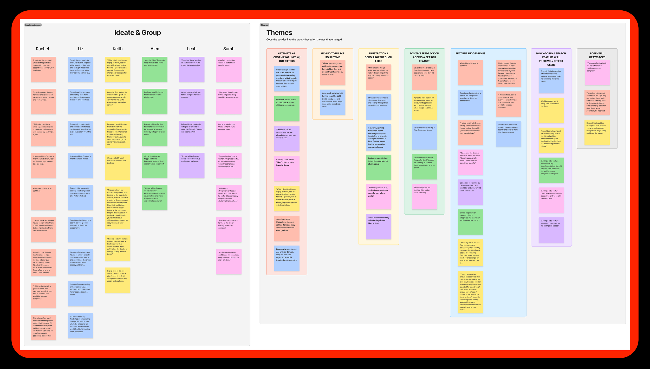 Following my initial research, I conducted six user interviews, each lasting 30-45 minutes. The goal was to understand how users currently manage their liked items, their desires for improved organizational tools, and their frustrations with the existing system. Through these conversations, clear patterns emerged, highlighting the necessity for enhanced filtering and organizational features within the Depop app. These insights directly informed the design and development of the proposed feature, ensuring it aligns with user needs and expectations.